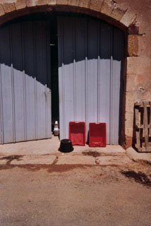 Entrée dans la cave avec bacs pour vendanges à la main